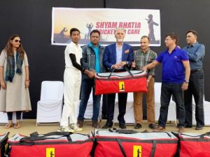 Shyam Bhatia visited Rajkot and distributed 50 cricket kits to the Saurashtra Cricket Association. Niranjan Shah, head of the Saurashtra Cricket Association, and his son Javdev Shah, received the kits. They were handed over to the association to be distributed to local schools and district councils.